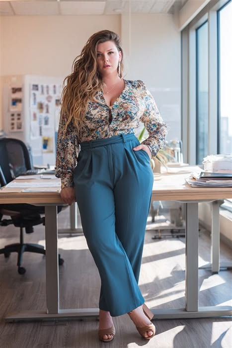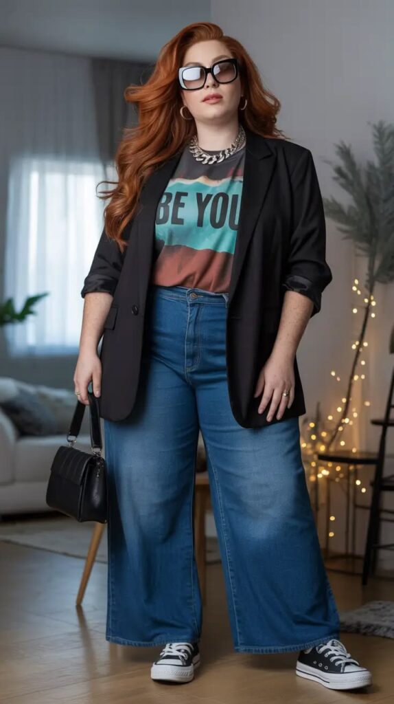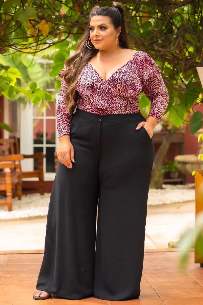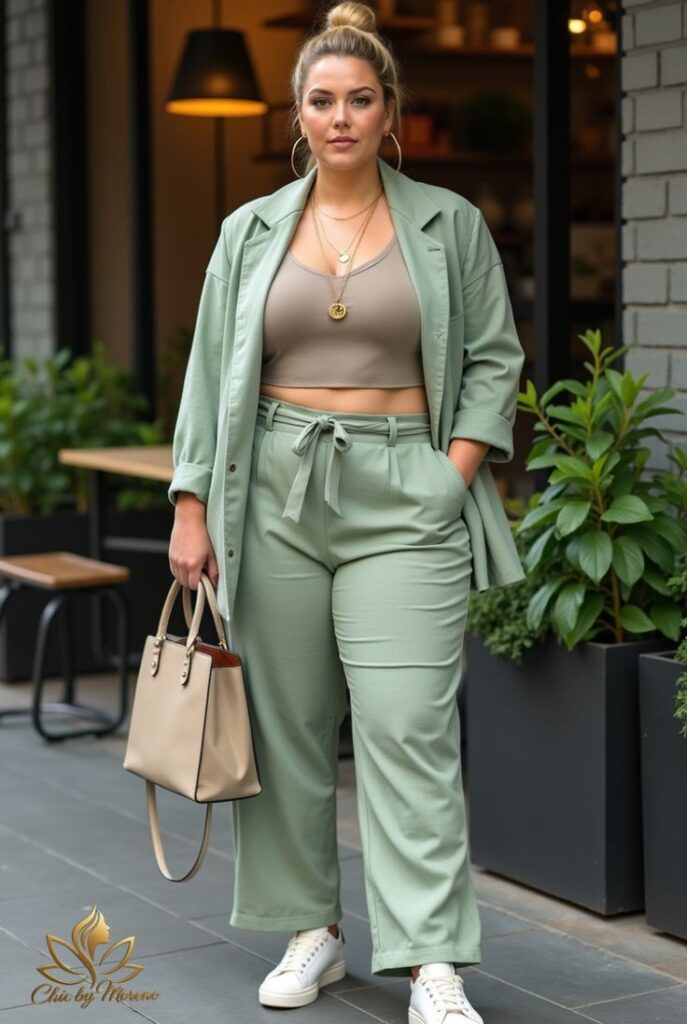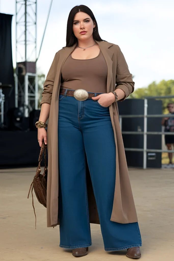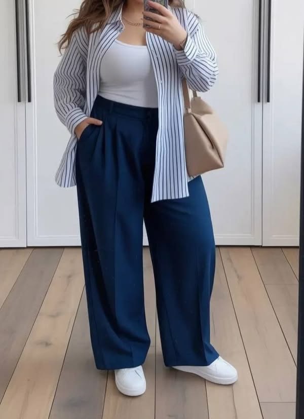 - Corte recto o «Wide Leg»: Al añadir volumen en la parte inferior de la pierna, compensas el volumen del torso, creando una armonía visual de reloj de arena.